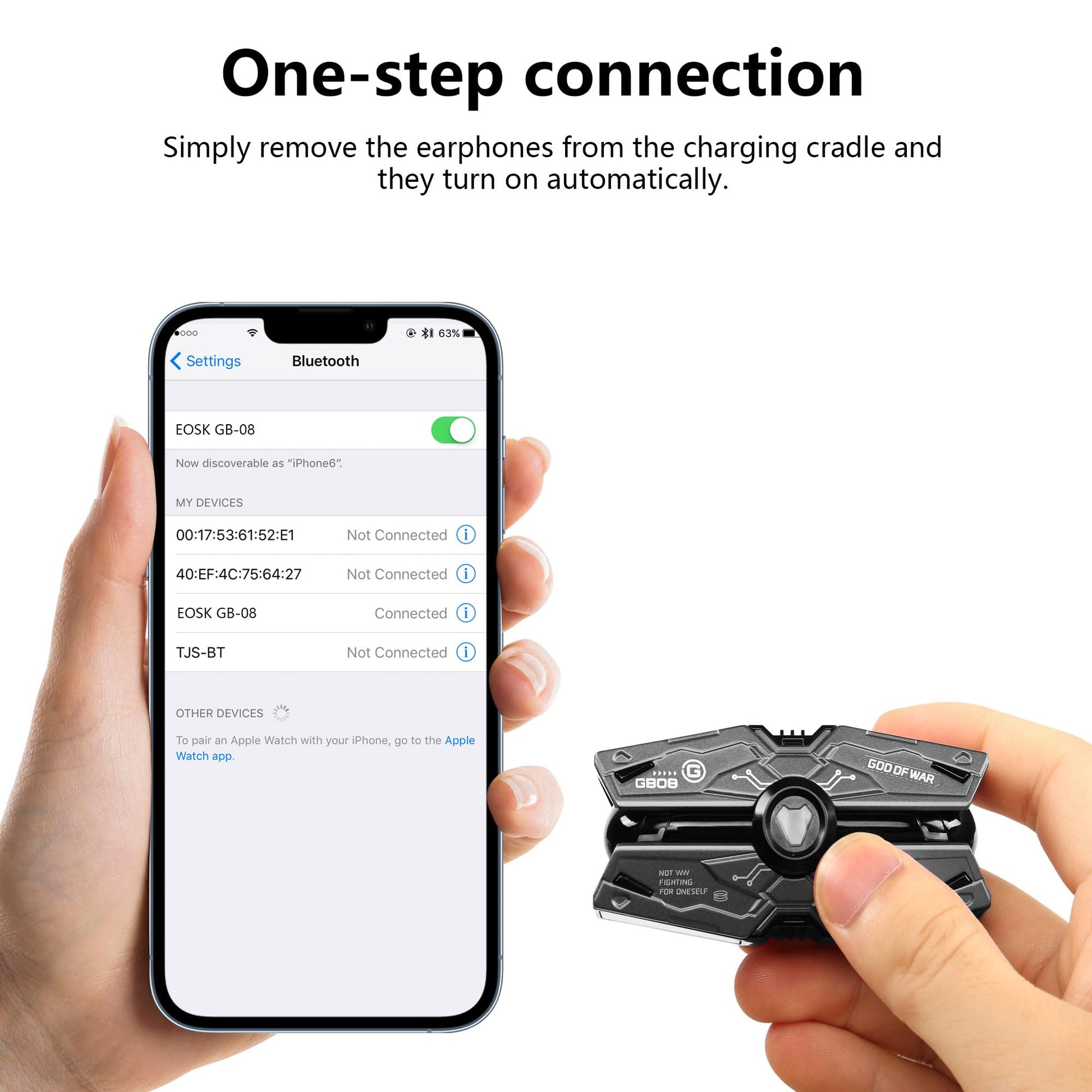 - 🗲【One-step connection】Simply remove the earphones from the charging cradle and they turn on automatically. Turn on the function of your device and search it to establish connection in seconds. compatible with Windows PCs, Android and iOS devices.