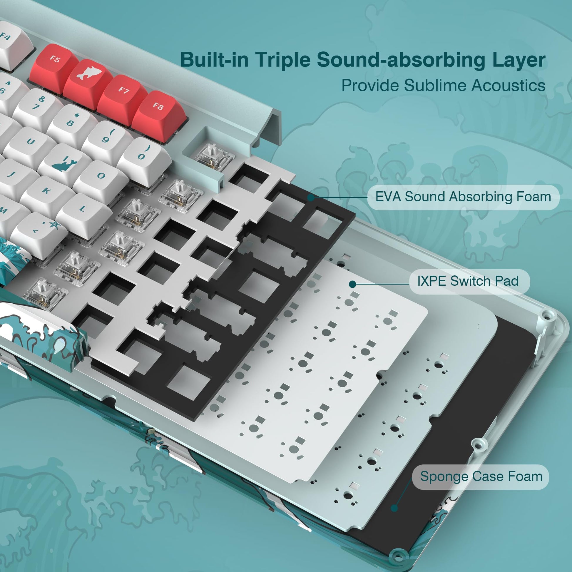 - 【Unique silencing Installation Design】This custom keyboard has built-in triple absorption layers, including an EVA sound absorbing foam, an IXPE switch pad and the sponge case Foam, In addition, silencer foam installed under the space bar, which increase the rebound speed of the keys while reducing vibration, resulting in improved key sound for a unique typing feel.