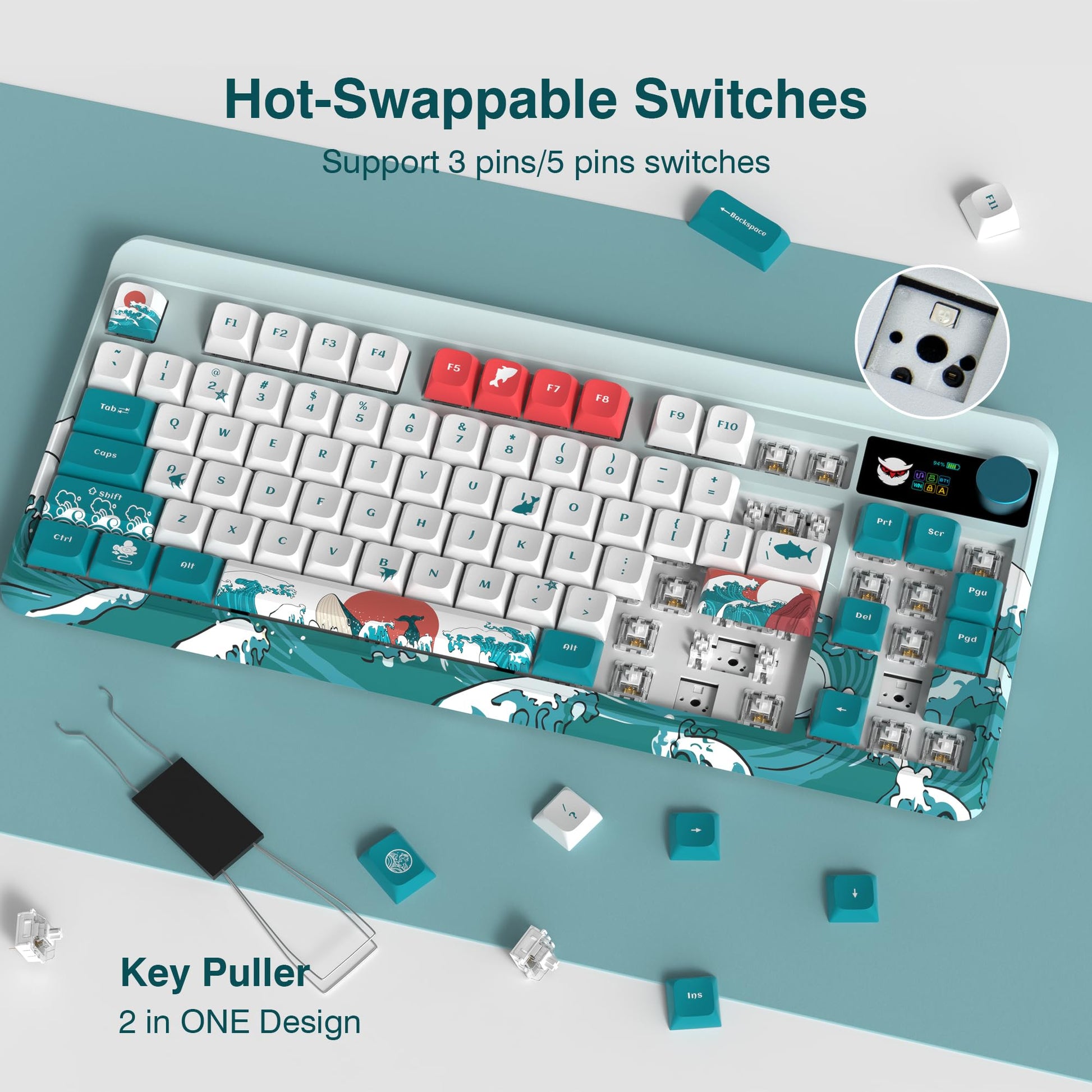 - 【Smart OLED Color Display and Knob Design】Womier M87 PRO gaming keyboard built-in smart OLED color display can intuitively display the keyboard status, including custom gif image, caps lock, connection mode, WIN/MAC, battery. Built-in mechanical knobs allow quick adjustment of complex functions: connection, system, backlit brightness/speed, RGB mode/color, volume & language.